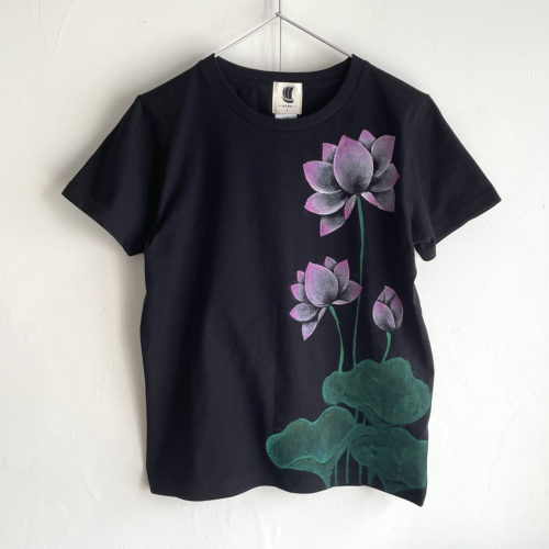 当店で販売していた蓮柄ポロシャツを見て下さったお客様から同じデザインで黒いTシャツに描けないかとのご希望でオーダーを頂きました。